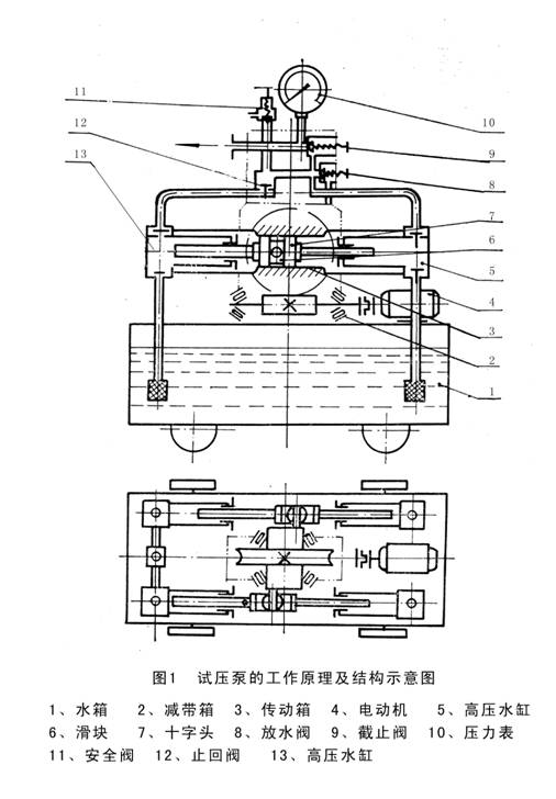 在柱塞的往復(fù)作用下,4只水缸內(nèi)的工作容積形成周期變化。當(dāng)柱塞為吸入行程時,出水閥關(guān)閉,隨水缸工作容積的增大,缸內(nèi)形成真空,水箱內(nèi)的工作介質(zhì)在大氣壓力的作用下,通過濾網(wǎng)、吸水管、頂開進(jìn)水閥進(jìn)入缸體內(nèi)。當(dāng)柱塞為排出行程時,進(jìn)水閥關(guān)閉,出水閥被迫開啟,柱塞將工作介質(zhì)通過出水閥輸入集水器,輸送到被試容器內(nèi),直至達(dá)到某一預(yù)定的試驗壓力,實現(xiàn)試壓的目的。