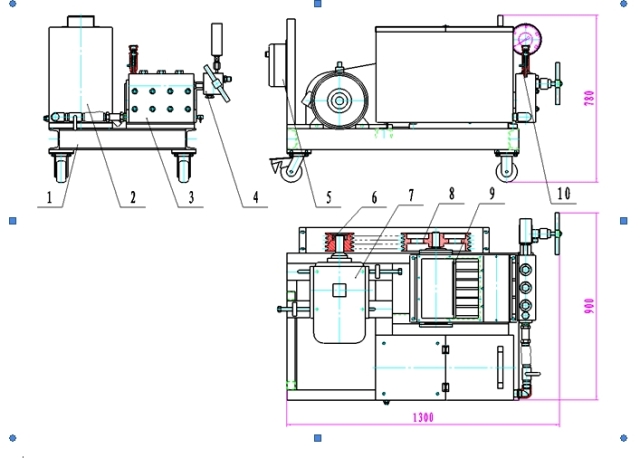 1.機(jī)架 2.水箱部分 3.液力端 4.止回卸壓閥 5.電機(jī)啟動(dòng)器